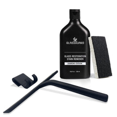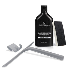 - Remove the GLASSGUARD™ Glass Restoration Stain Remover bottle and White Scourer Pad from the box or package.